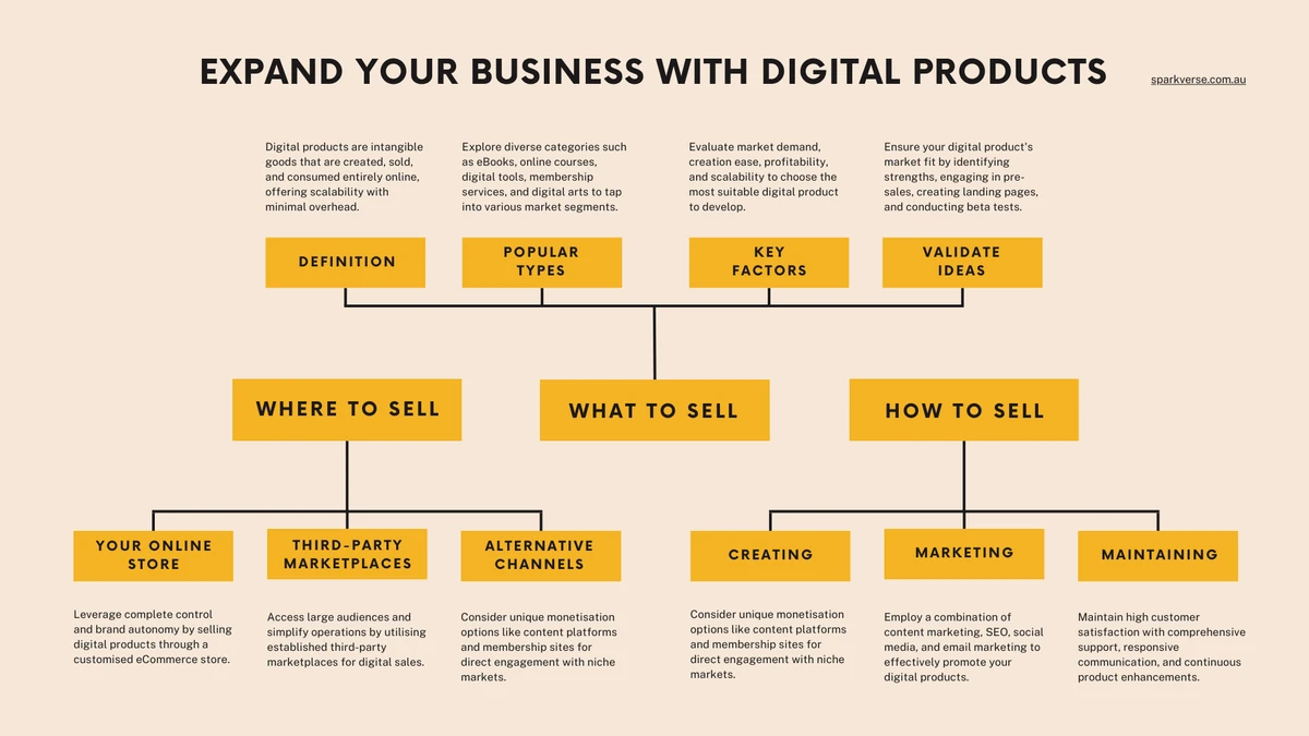 In summary, expanding your business by selling digital products in Australia offers an exciting opportunity to leverage your expertise with minimal overhead, access a broader market, and significantly increase profitability. From selecting the right products such as eBooks, online courses, and digital art to choosing the best platform for sales—whether your own eCommerce store, third-party marketplaces, or alternative channels—each step is crucial for success. Furthermore, managing the lifecycle of your products, from creation through marketing to customer service, ensures that you maintain a high standard of quality and customer satisfaction.
